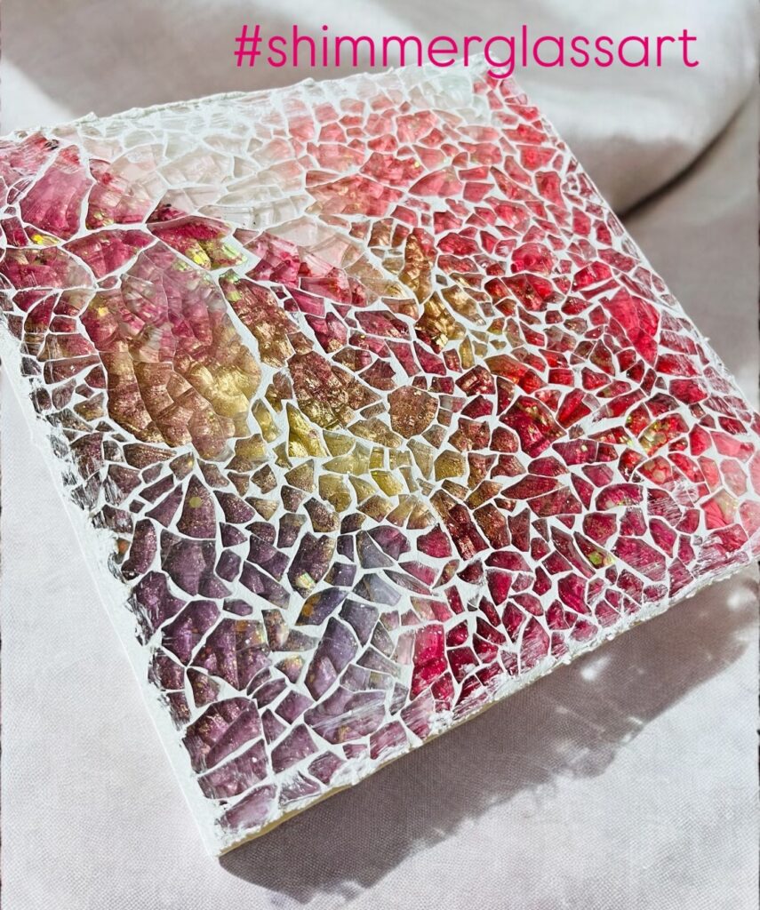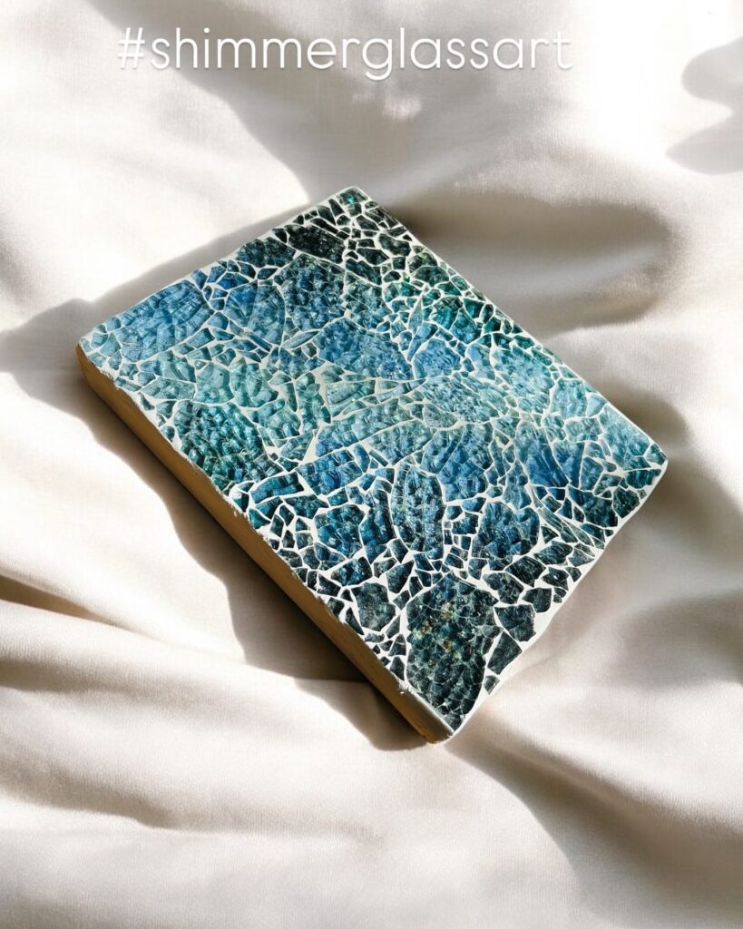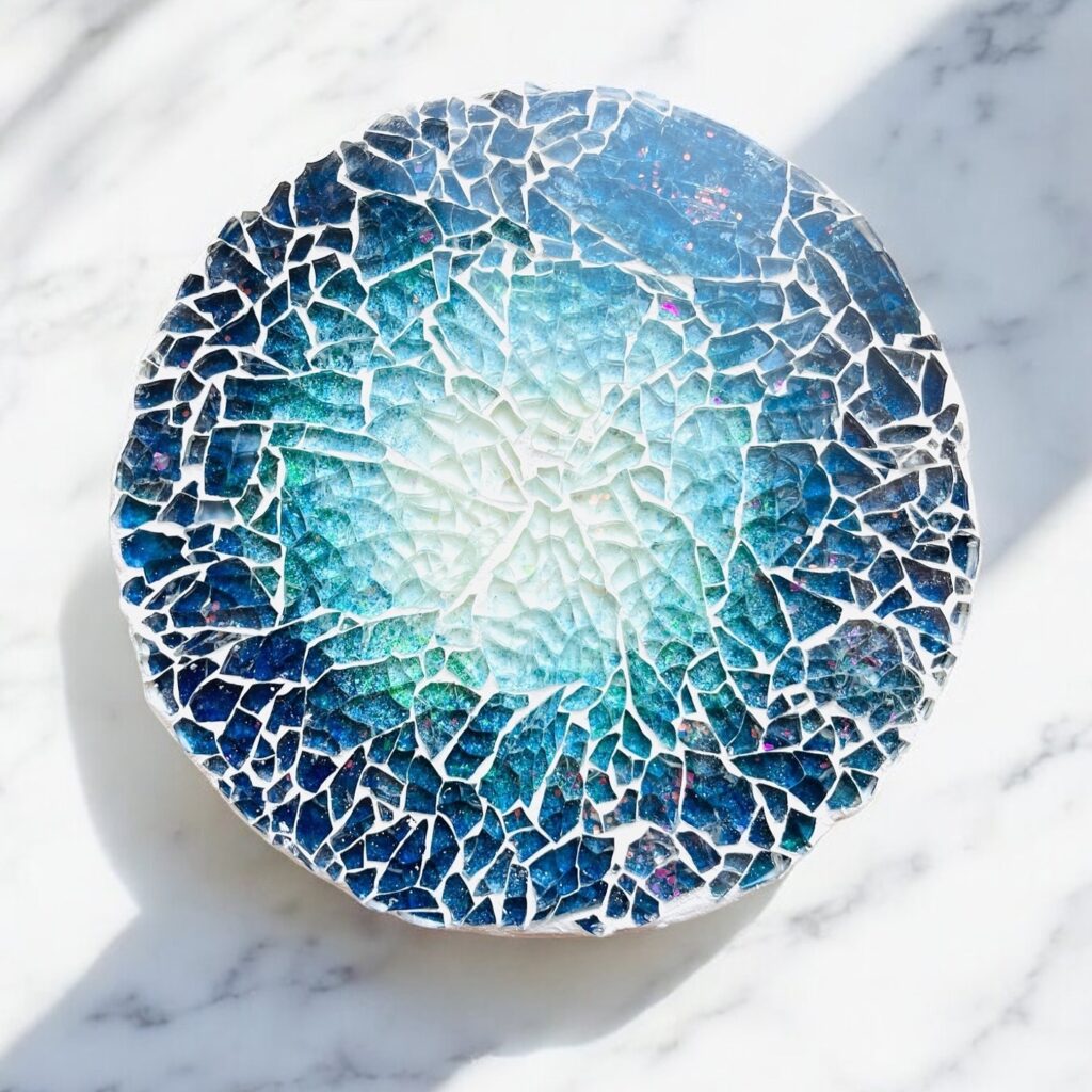 ガラスの欠片で煌めくモザイクのアート作品を制作します。サイズはF0です。